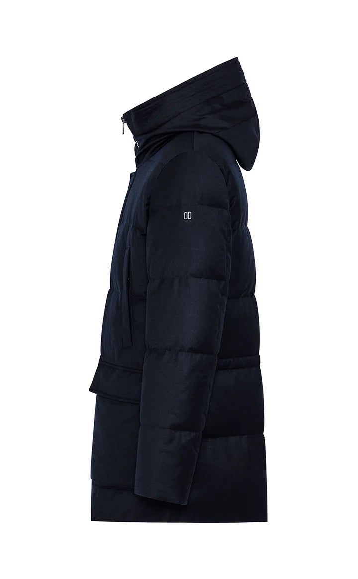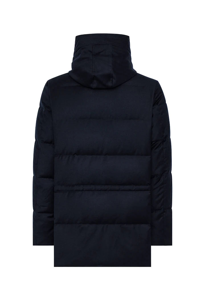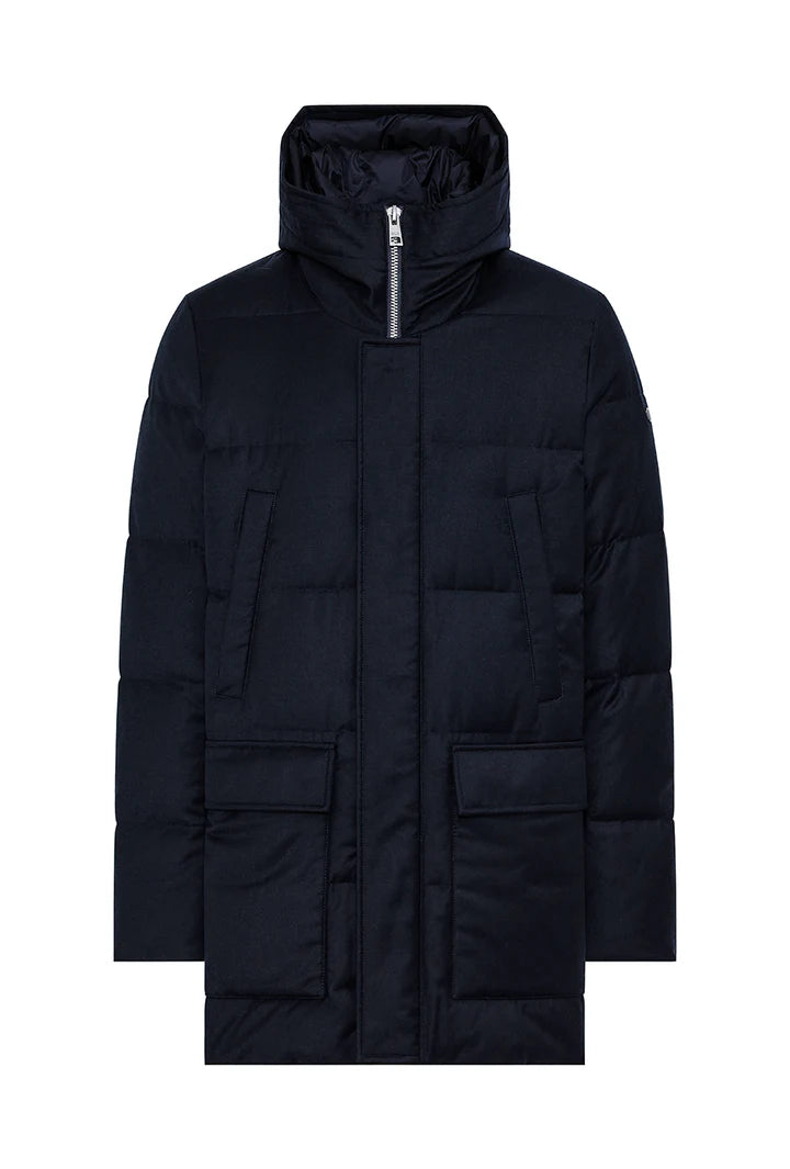 Quilted down padded parka in pure wool. Front closure with full-height zipper and hidden snap buttons, combination of low pockets with flap and snap closure and high hand warmer pockets. Technical knitted cuff at the bottom of the sleeve. Multi-functional pockets on the inside.