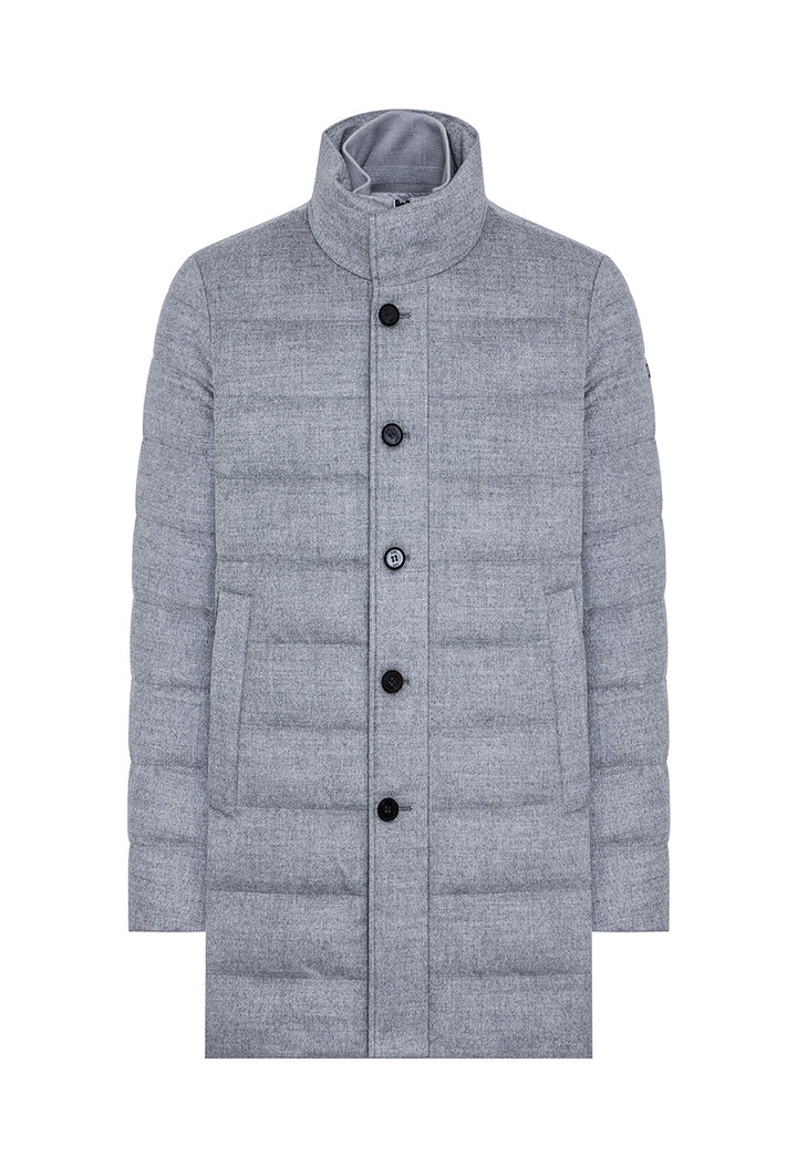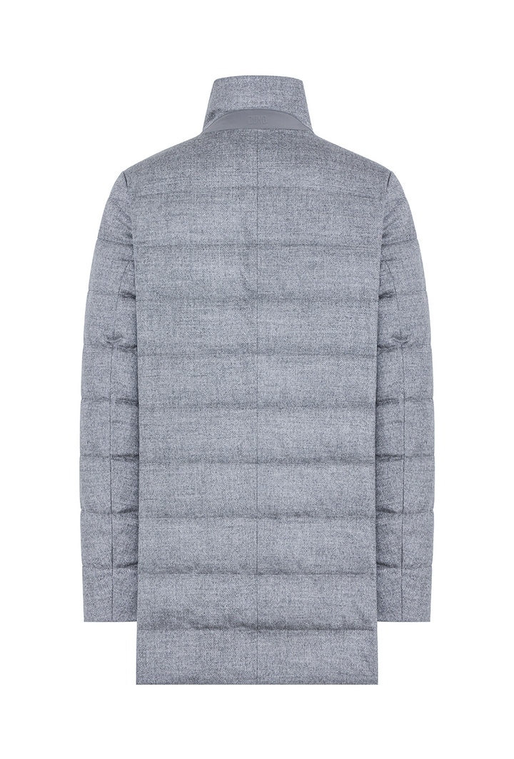 Technical wool down jacket featuring a detachable bib, made of technical fabric with knitted collar and double-slider zipper closure. Front closure with buttons hidden by the placket, stand collar with snap closure, side welt pockets with hidden zipper and inside cuff in technical knit at the bottom of the sleeve. Neoprene detail with embossed logo at the back collar. Multi-functional pockets on the inside, enriched with reflective details.