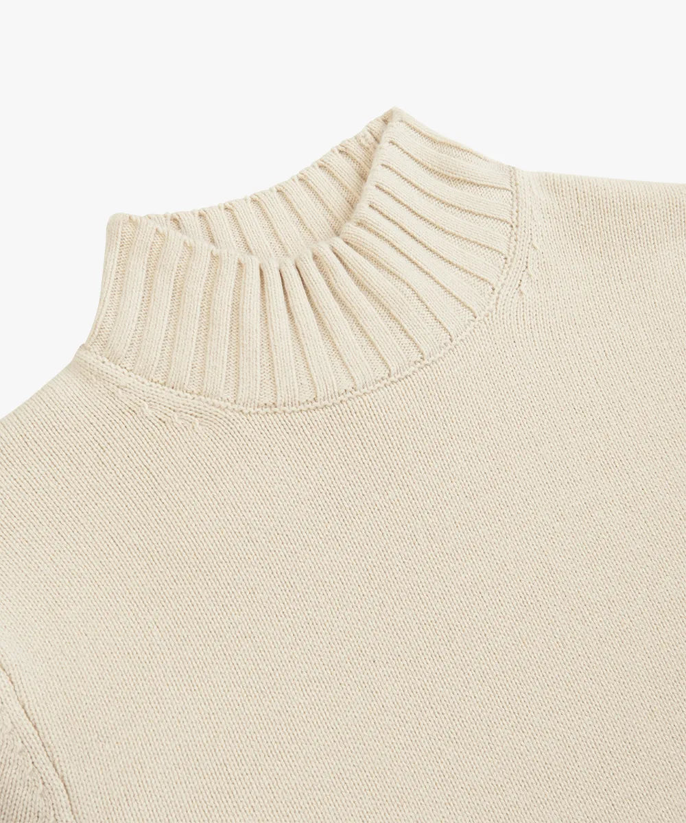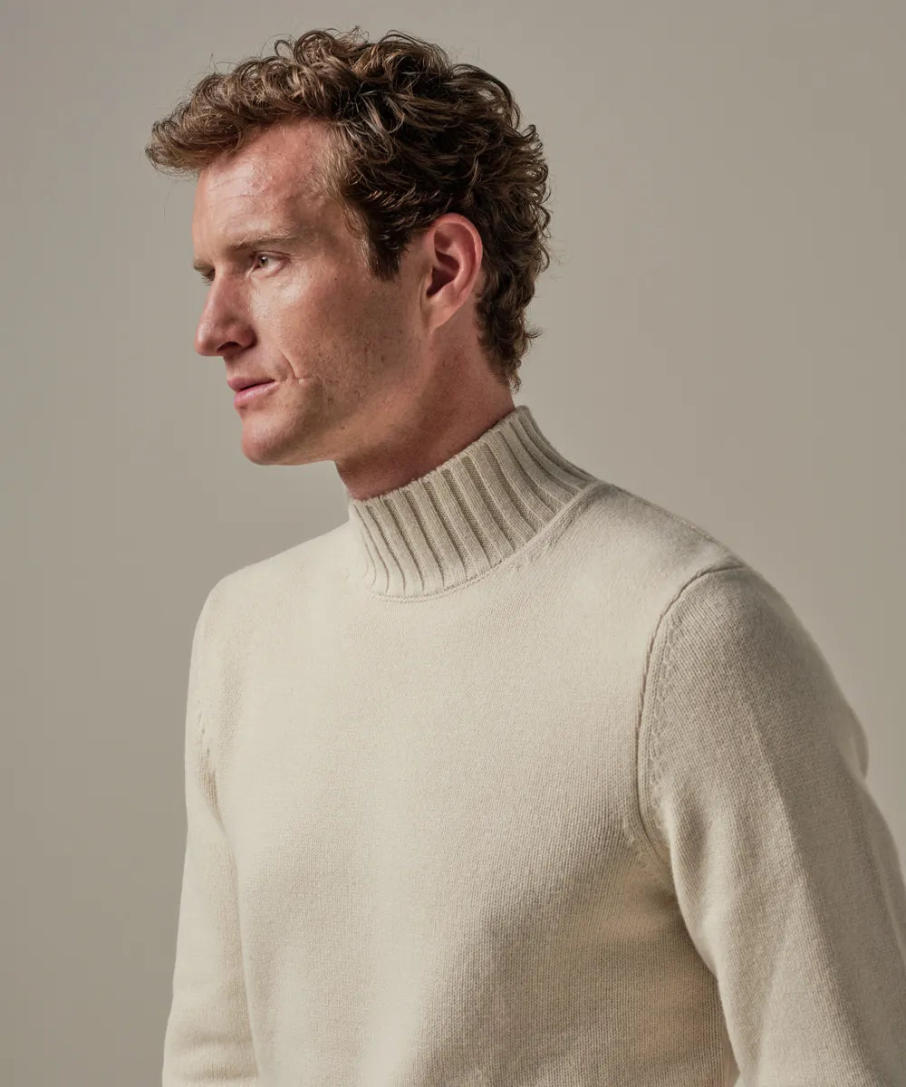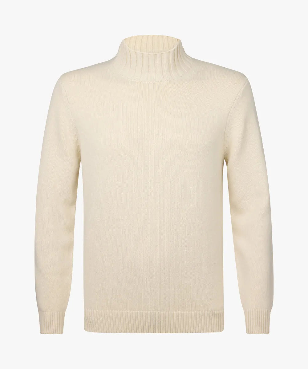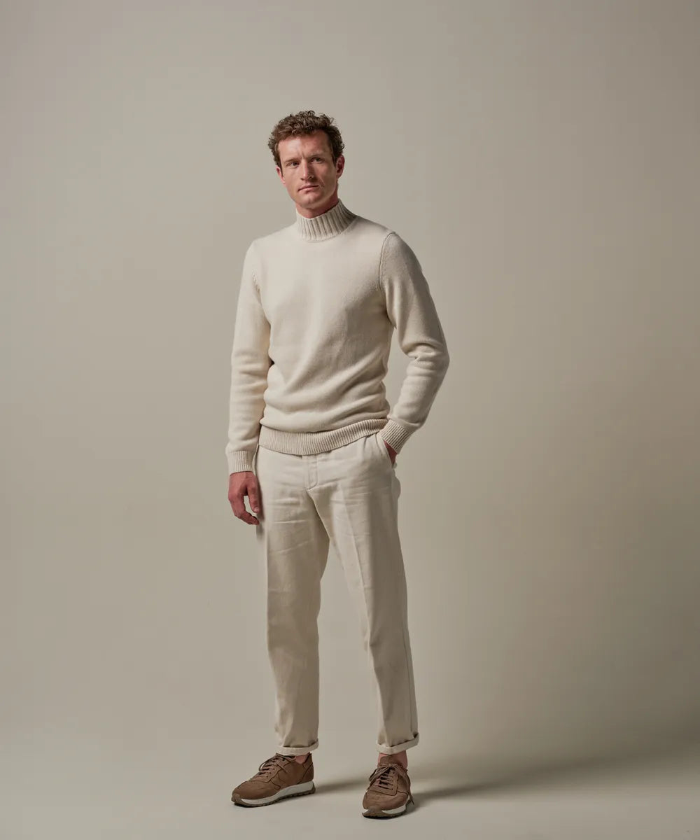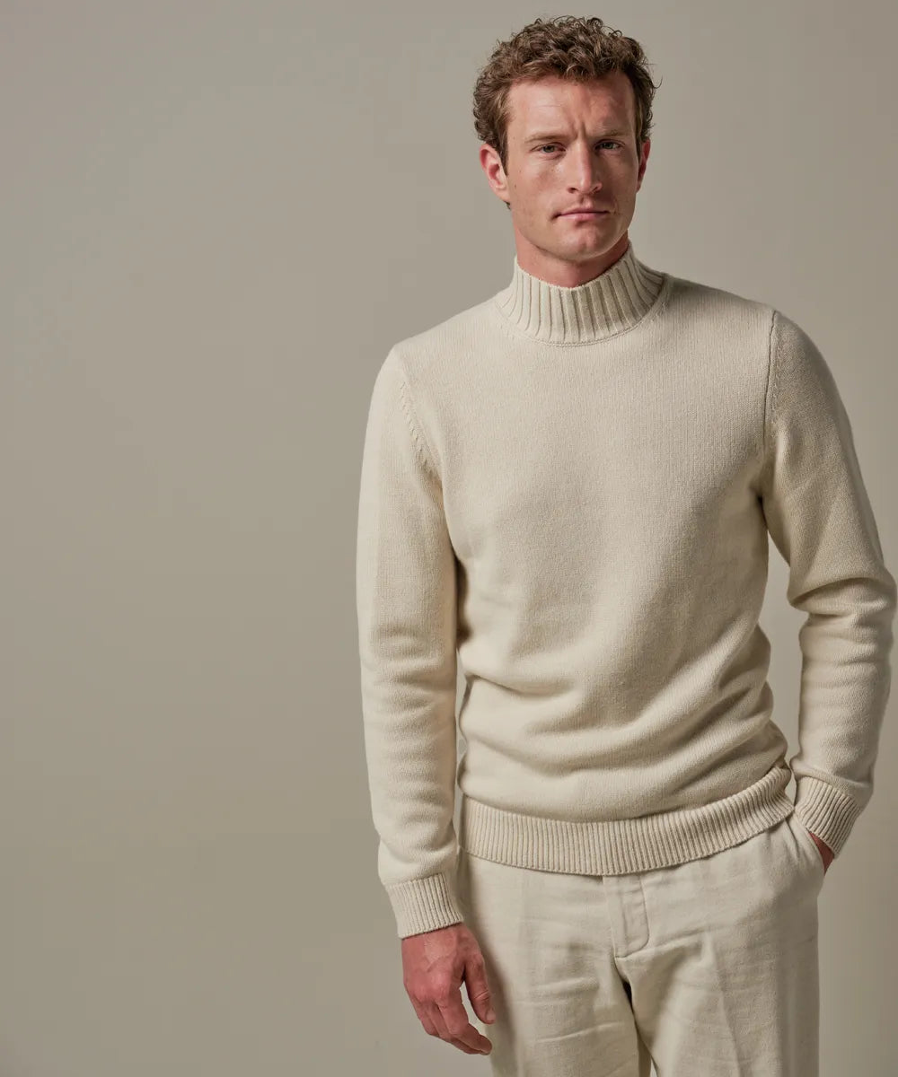 This off-white jumper has a mock neck. This makes the collar stand a bit higher but not as high as a turtleneck. A beautiful chunky-knit mockneck in a high-quality wool blend. The wool keeps you wonderfully warm and the 20% modal ensures a comfortable feel.