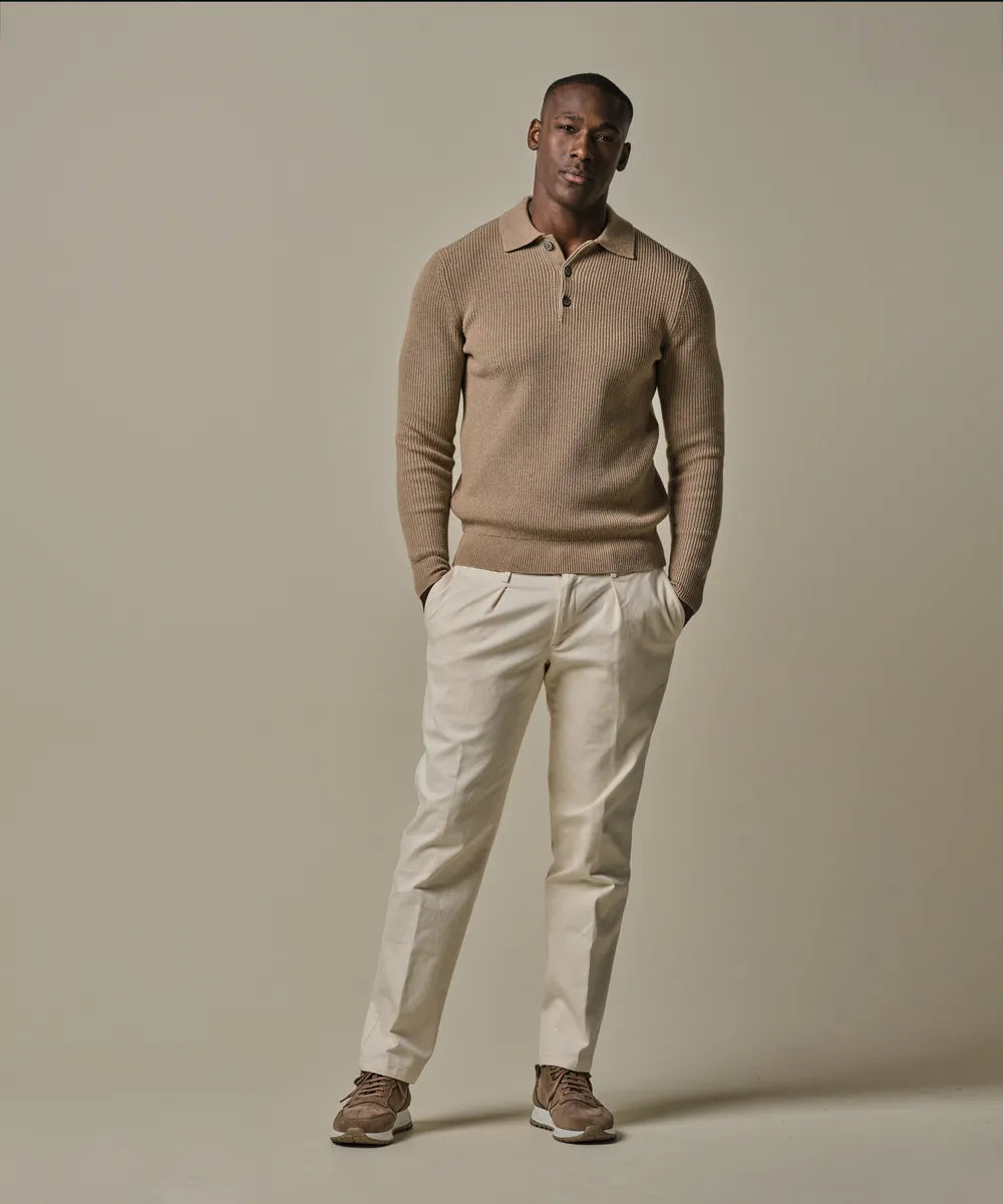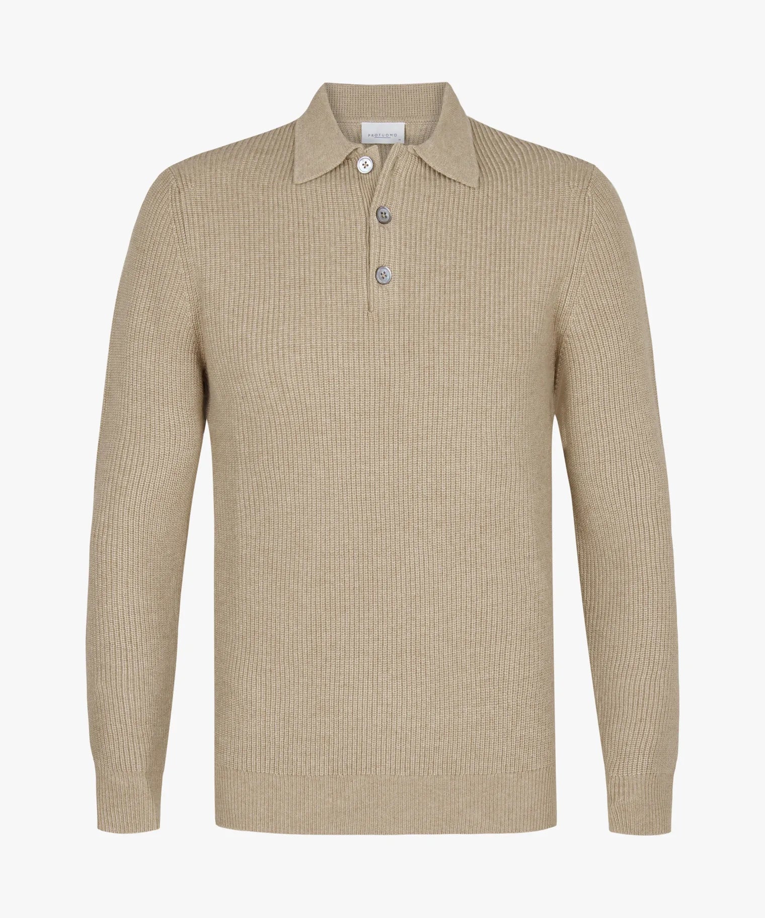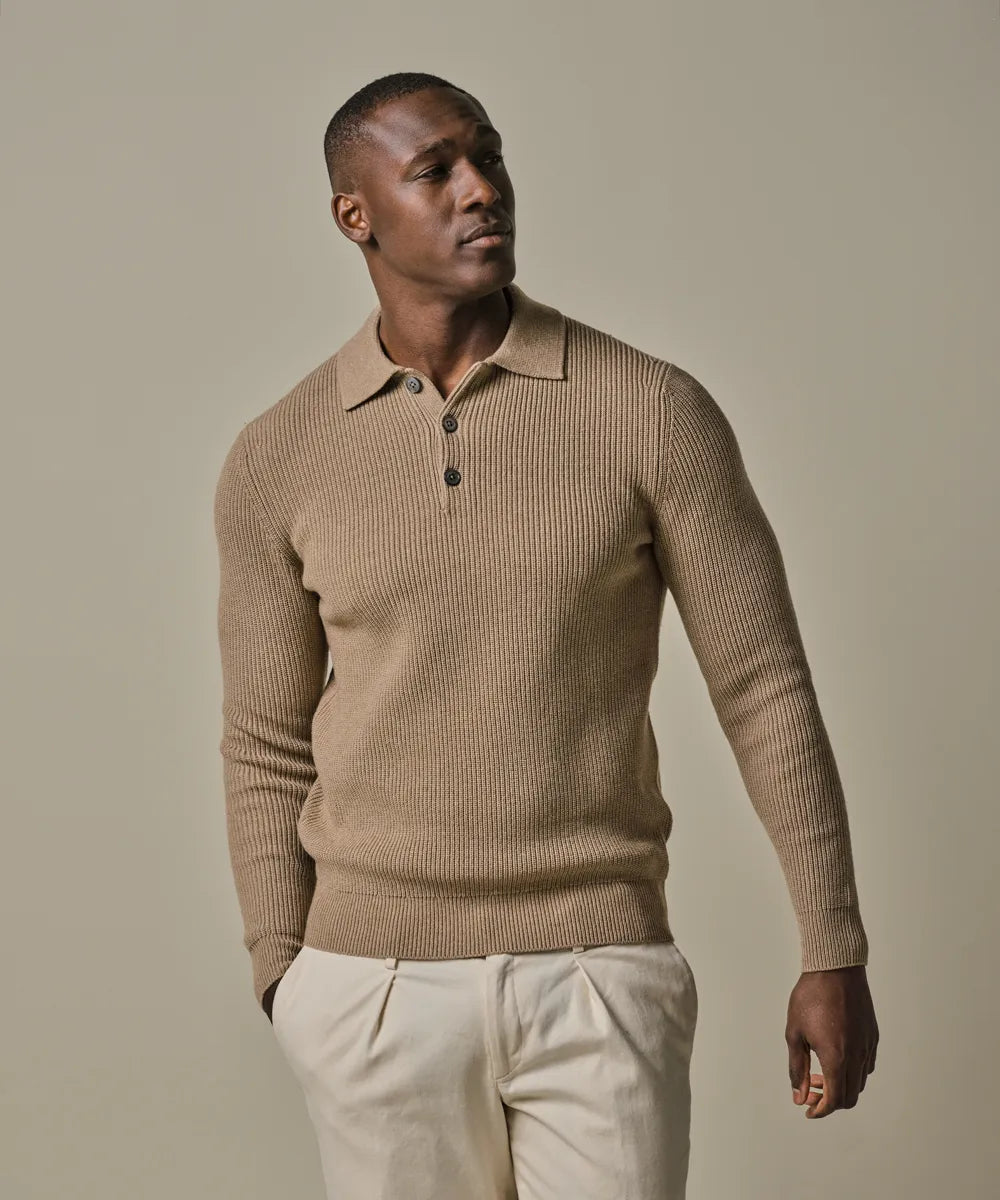 This longsleeve polo is crafted from a fine ribbed blend of cozy cotton and wool, delivering softness with a touch of warmth. Genuine mother-of-pearl buttons add a dash of luxury, making this polo as stylish as it is comfortable. Perfect for those who like to keep it classy with a fun twist!